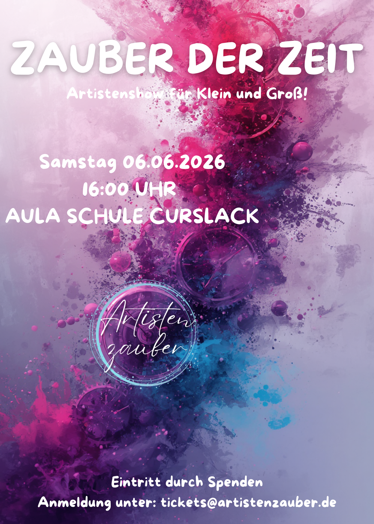 Bitte beachten Sie, dass die Plätze begrenzt sind. Sichern Sie sich daher schnell Ihren Eintritt, indem Sie sich unter folgender E-Mail-Adresse anmelden: tickets@artistenzauber.de.